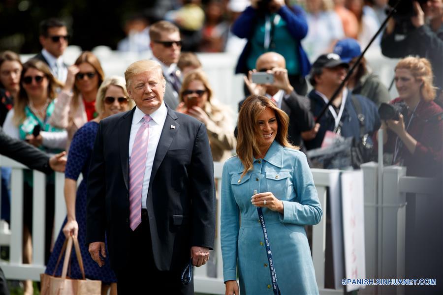 El presidente estadounidense, Donald Trump (i-frente), y su esposa, Melania Trump (d-frente), asisten a la tradicional búsqueda de huevos de Pascua, en la Casa Blanca, en Washington D.C., Estados Unidos, el 22 de abril de 2019. La Casa Blanca realizó el lunes la 141 edición de la tradicional búsqueda de huevos de Pascua que se lleva a cabo cada a?o en el Jardín Sur. (Xinhua/Ting Shen)