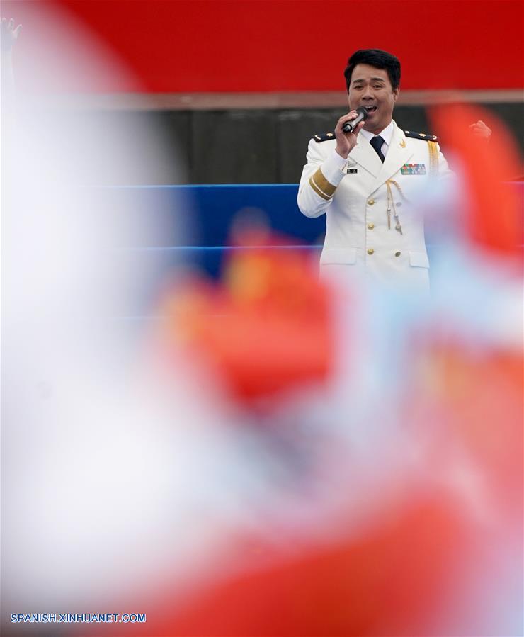 Un soldado cantan durante la celebración del 70 aniversario de la fundación de la Armada del Ejército Popular de Liberación (EPL) en Qingdao, de la provincia de Shandong, en el este de China, el 22 de abril de 2019. China celebró el lunes por la tarde una interpretación conjunta de música militar en la ciudad costera de Qingdao, en el este de China, con motivo del 70o aniversario de la fundación de la Armada del Ejército Popular de Liberación (EPL). (Xinhua/Wang Yuguo)