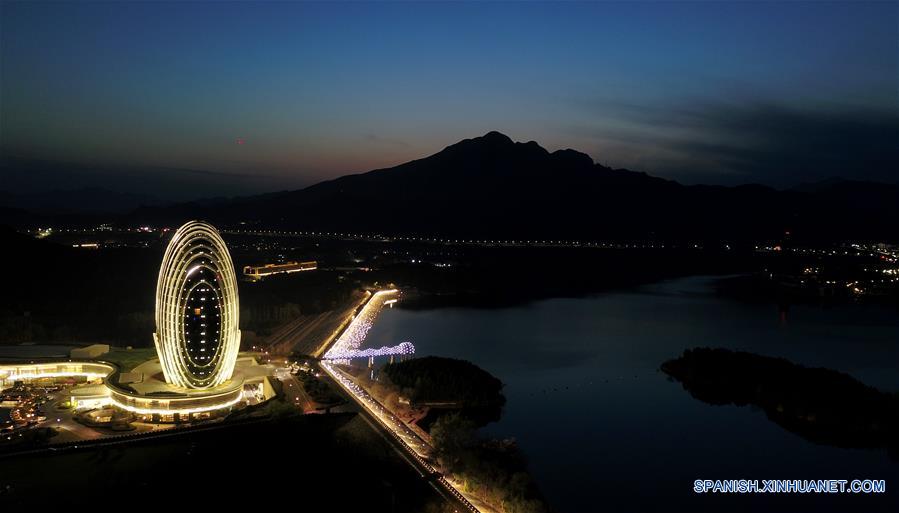 BEIJING, 24 abril, 2019 (Xinhua) -- Imagen del 1 de abril de 2019 de una vista aérea nocturna del Sunrise East Kempinski Hotel por el lago Yanqi, en Beijing, capital de China. El II Foro de la Franja y la Ruta para la Cooperación Internacional se llevará a cabo del 25 al 27 de abril en Beijing. (Xinhua/Zhang Yuwei)