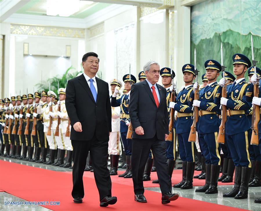 BEIJING, 24 abril, 2019 (Xinhua) -- El presidente chino, Xi Jinping, ofrece una ceremonia de bienvenida para el presidente de Chile, Sebastián Pi?era, previo a sus conversaciones en el Gran Palacio del Pueblo en Beijing, capital de China, el 24 de abril de 2019. Xi y Pi?era sostuvieron conversaciones el miércoles antes del II Foro de la Franja y la Ruta para la Cooperación Internacional. (Xinhua/Yin Bogu)