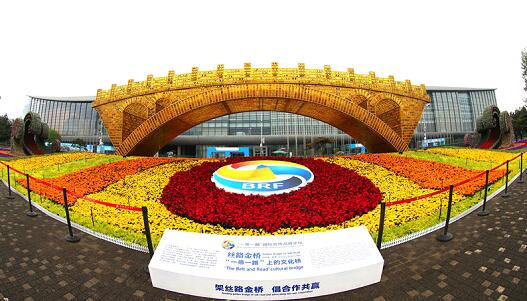El puente dorado sobre la Ruta de la Seda, símbolo temático del II Foro La Franja y La Ruta para la Cooperación Internacional, se expone frente al Centro Nacional de Convenciones de China, en Beijing, 20 de abril del 2019. (Foto: Pueblo en Línea)