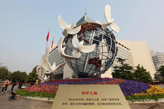 Flores y decoraciones se observan en las calles de Beijing durante el II Foro de La Franja y La Ruta para la Cooperación Internacional. (Foto: Pueblo en Línea)