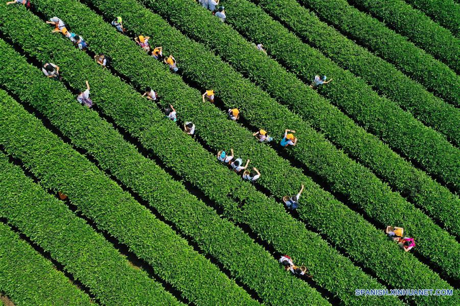 CHONGQING, abril 25, 2019 (Xinhua) -- Vista aérea de alumnos recolectan hojas de té en el jardín de té Dingxin en la Monta?a Baixiang, en Chongqing, en el suroeste de China, el 25 de abril de 2019. Más de 300 alumnos del distrito de Banan llegaron el jueves al jardín de té para experimentar la recolección de hojas de té, su elaboración y aprender acerca de la cultura del té. El distrito de Banan de Chongqing combina la cultura del té con el turismo y la educación en los últimos a?os para promover esta industria. (Xinhua/Wang Quanchao)