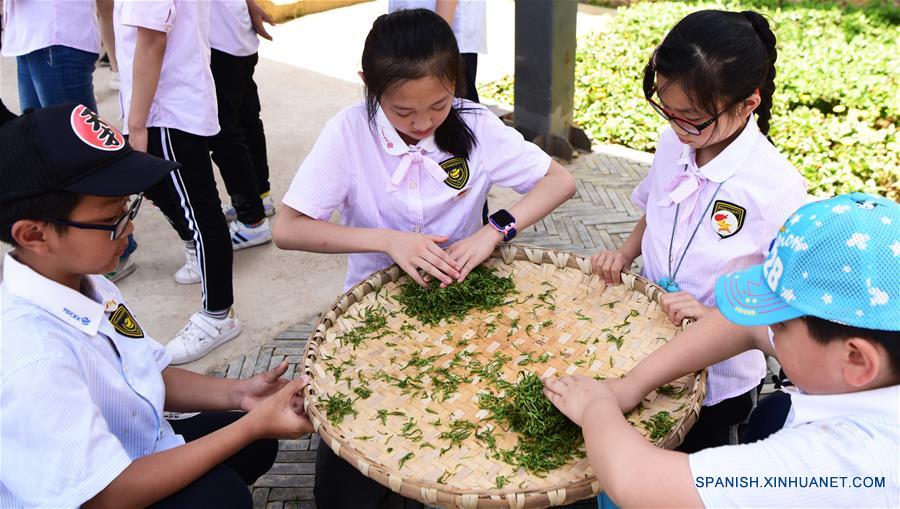 CHONGQING, abril 25, 2019 (Xinhua) -- Alumnos experimentan el enrollado de las hojas de té en el jardín de té Dingxin en la Monta?a Baixiang, en Chongqing, en el suroeste de China, el 25 de abril de 2019. Más de 300 alumnos del distrito de Banan llegaron el jueves al jardín de té para experimentar la recolección de hojas de té, su elaboración y aprender acerca de la cultura del té. El distrito de Banan de Chongqing combina la cultura del té con el turismo y la educación en los últimos a?os para promover esta industria. (Xinhua/Wang Quanchao)
