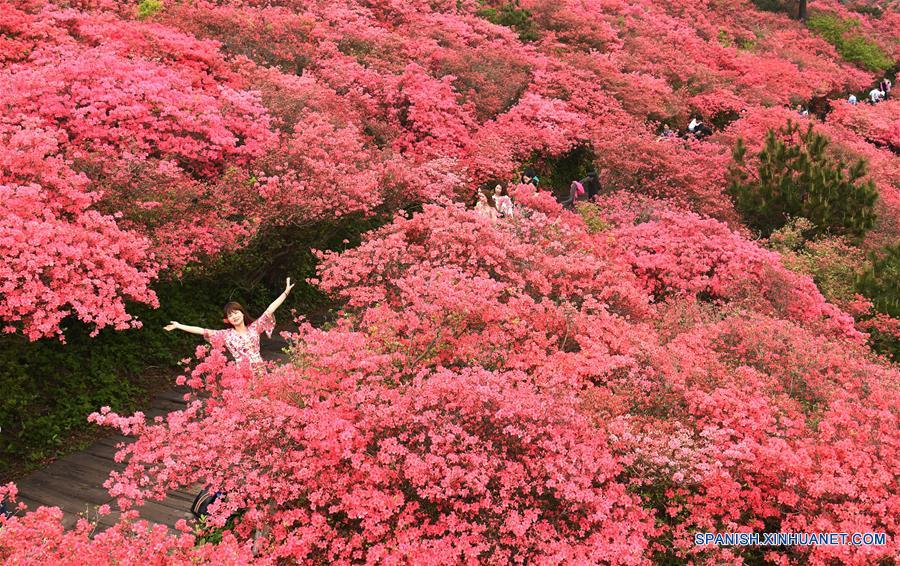 HUBEI, 25 abril, 2019 (Xinhua) -- Personas pasan el tiempo entre las flores de azalea en la monta?a Guifeng, en Macheng, provincia de Hubei, en el centro de China, el 25 de abril de 2019. (Xinhua/Cheng Min)