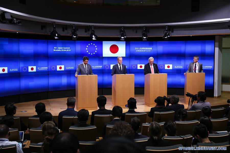 El presidente de la Comisión Europea, Jean-Claude Juncker (2-d), el presidente del Consejo Europeo, Donald Tusk (2-i), y el primer ministro de Japón, Shinzo Abe (i), participan en una conferencia de prensa durante la cumbre entre la Unión Europea (UE) y Japón, en Bruselas, Bélgica, el 25 de abril de 2019. La 26 cumbre entre la UE y Japón se realizó el jueves por la tarde en Bruselas con el presidente de la Comisión Europea, Jean-Claude Juncker, el presidente del Consejo Europeo, Donald Tusk, y el primer ministro de Japón, Shinzo Abe. (Xinhua/Zhang Cheng)