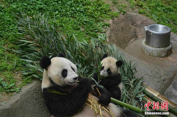 El panda gigante Ding Ding con su madre Hai Zi. [Foto / chinanews.com]