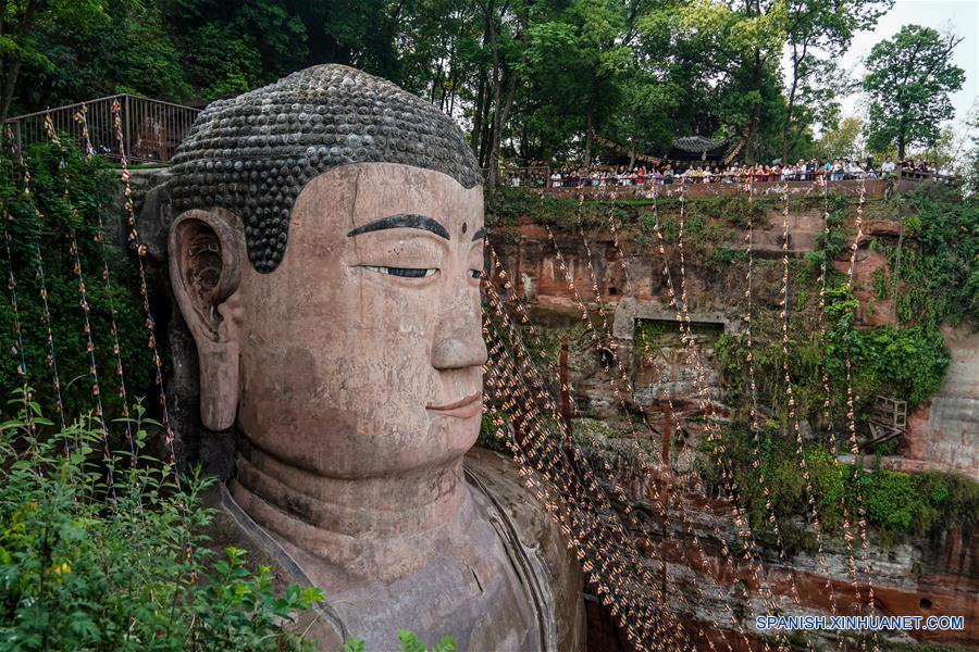 SICHUAN, 27 abril, 2019 (Xinhua) -- Imagen del 26 de abril de 2019, de turistas observando la estatua del Gran Buda de Leshan, en la ciudad de Leshan, en la provincia de Sichuan, en el suroeste de China. El gran Buda de Leshan, localizado en la provincia suroccidental china de Sichuan, se reabrió el viernes a los turistas tras una revisión de seis meses que formó parte de su plan de reparación. La estatua, de 71 metros de altura y reconocida como el mayor Buda del mundo, está a las afueras de la ciudad de Leshan. El pecho y abdomen presentan grietas, según el comité de administración de la área panorámica del Buda de Leshan. (Xinhua/Zhang Chaoqun)