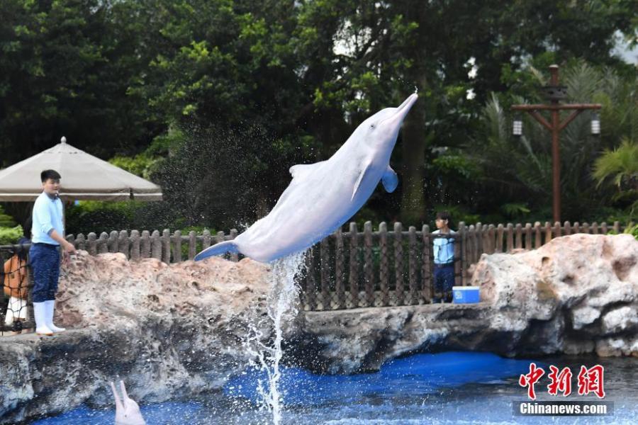 Un delfín blanco chino actúa durante un evento en el Reino del Océano Chimelong en Zhuhai, provincia de Guangdong, el 27 de abril del 2019. Aclamado como las "sirenas" o “pandas gigantes del mar,", los delfines blancos chinos a menudo se avistan en el Mar Oriental de China. Estas criaturas están bajo la protección estatal de primera clase. El evento forma parte de una campa?a anual de conservación destinada a concienciar sobre el cuidado que hay que brindarle a este especie, que se encuentra en peligro de extinción. (Foto: SNC)