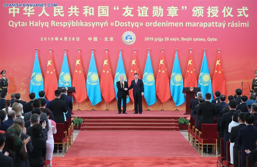 El presidente chino, Xi Jinping, ofrece una ceremonia para otorgar al primer presidente de Kazajistán, Nursultan Nazarbayev, la Medalla de Amistad de la República Popular China en el Gran Palacio del Pueblo, en Beijing, capital de China, el 28 de abril de 2019. (Xinhua/Yao Dawei)