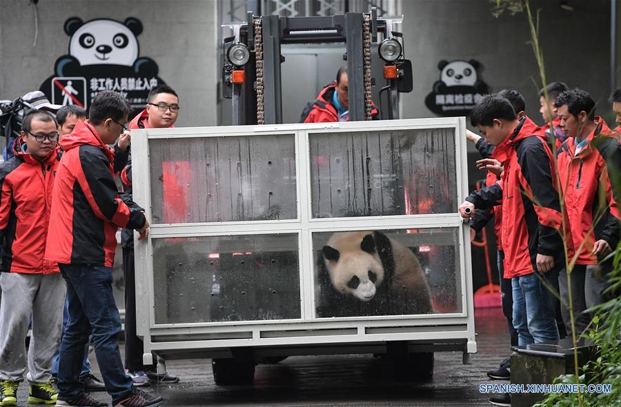 SICHUAN, 29 abril, 2019 (Xinhua) -- Empleados trasladan una jaula de transporte que contiene a Ding Ding, una panda nacida en 2017, a un camión en la base de Bifengxia del Centro de Conservación e Investigación de Panda Gigantes de China en Ya'an, provincia de Sichuan, en el suroeste de China, el 29 de abril de 2019. Los investigadores chinos celebraron una ceremonia para despedir a Ru Yi y Ding Ding, que vivirán en Moscú para un proyecto conjunto de investigación de 15 a?os. Ru Yi, un macho de tres a?os, y Ding Ding, una hembra de dos, llegarán a Moscú a las 22:00 del lunes (hora de Beijing), según el Centro de Conservación e Investigación de Panda Gigantes de China en la provincia de Sichuan. (Xinhua/Xue Yubin)