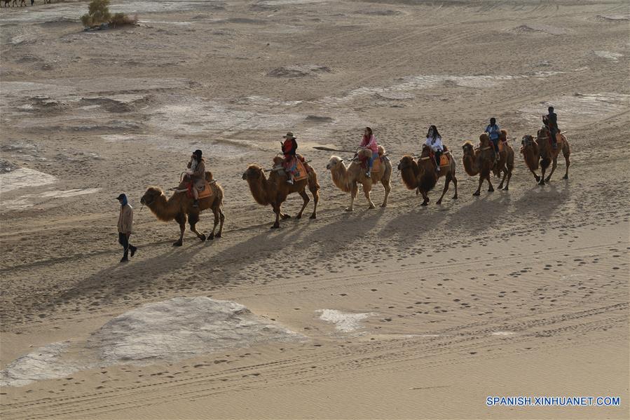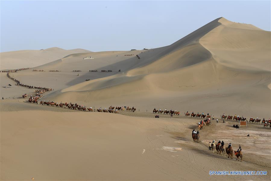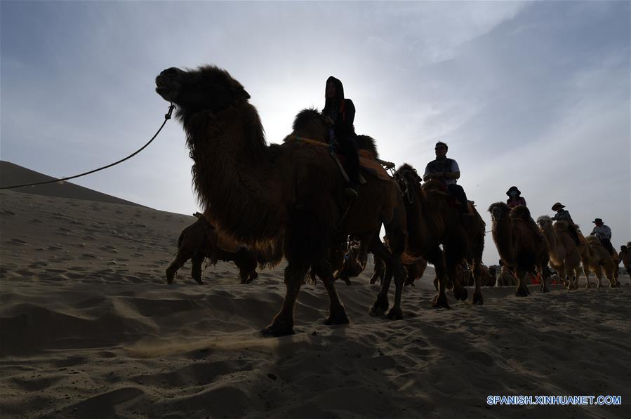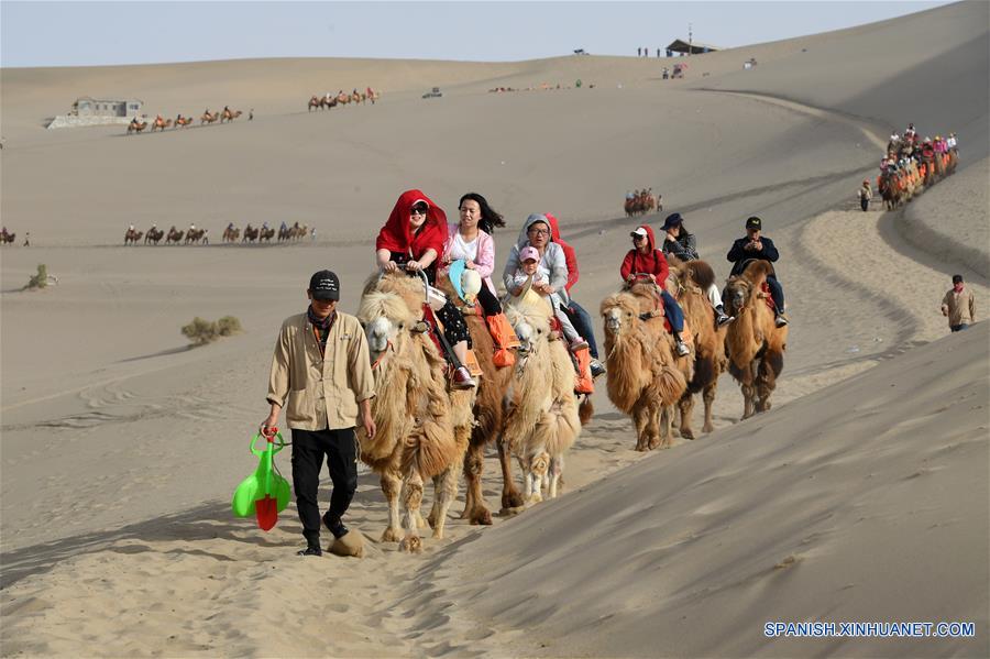 GANSU, 1 mayo, 2019 (Xinhua) -- Turistas montan camellos en el área escénica de la Duna de Arena Mingsha y el Manantial de la Media Luna, durante el primer día de las vacaciones del Día de Mayo, de cuatro días de duración, en Dunhuang, en la provincia de Gansu, en el noroeste de China, el 1 de mayo de 2019. (Xinhua/Fan Peishen)