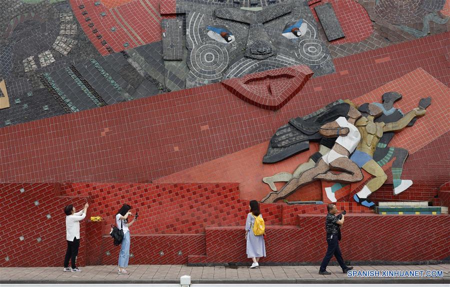 CHONGQING, 1 mayo, 2019 (Xinhua) -- Turistas toman fotografías de esculturas callejeras, durante el primer día de las vacaciones del Día de Mayo, de cuatro días de duración, en Chongqing, en el suroeste de China, el 1 de mayo de 2019. (Xinhua/Liu Chan)