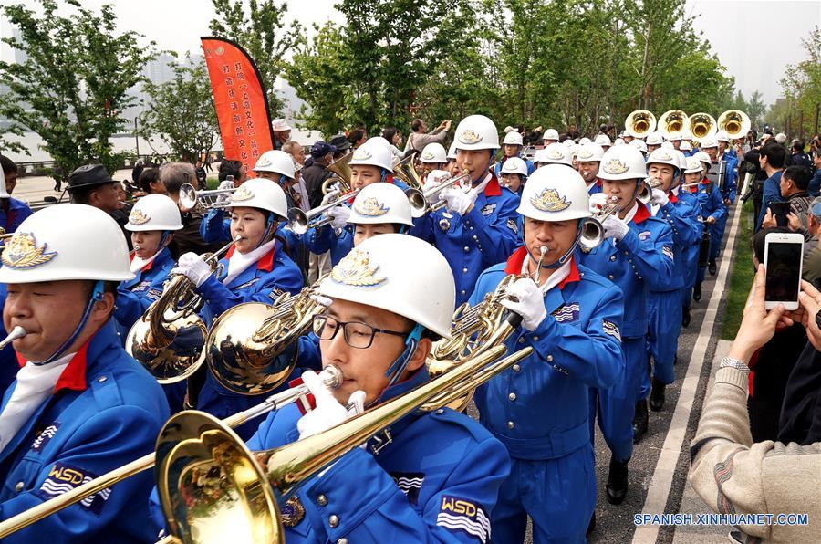 SHANGHAI, 1 mayo, 2019 (Xinhua) -- Turistas observan una presentación de una banda musical en la orilla del Río Huangpu, durante el primer día de las vacaciones del Día de Mayo, de cuatro días de duración, en Shanghai, en el este de China, el 1 de mayo de 2019. (Xinhua/Chen Fei)