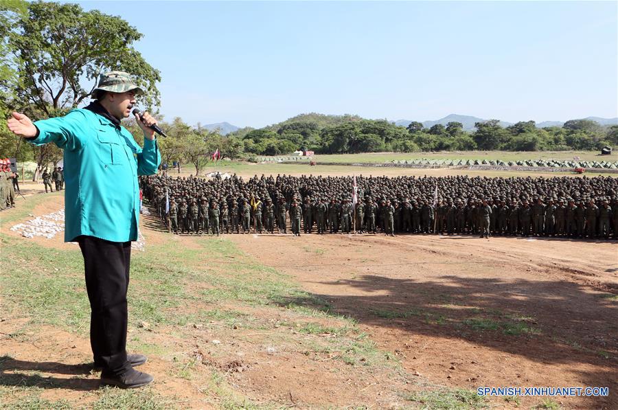Imagen cedida por la Presidencia de Venezuela del presidente venezolano, Nicolás Maduro, pronuncia participando en una jornada de adiestramiento en el centro de adiestramiento militar "José Laurencio Silva", en la localidad de El Pao, estado de Cojedes, Venezuela, el 4 de mayo de 2019. Durante los ejercicios que se realizaron en el centro de adiestramiento militar "José Laurencio Silva", Maduro aseguró: "Somos un país que tiene una poderosa Fuerza Armada Nacional Bolivariana (FANB) que debe estar más unida, más cohesionada y más leal que nunca". (Xinhua/Presidencia de Venezuela)