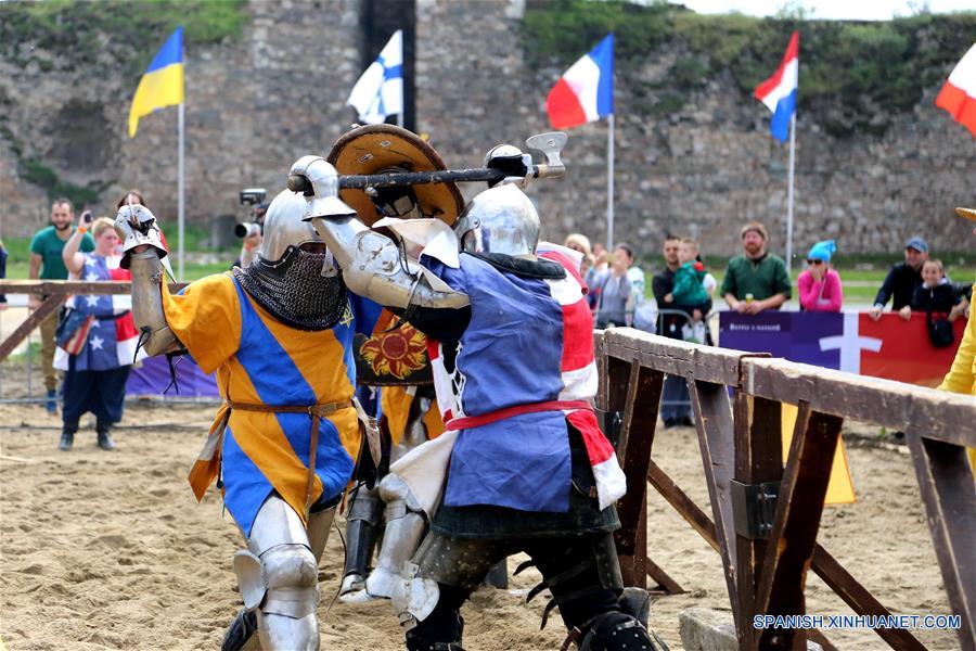 SMEDEREVO, 4 mayo, 2019 (Xinhua) -- Imagen del 2 de mayo de 2019, de personas vestidas con trajes medievales enfrentándose en el día de apertura del 10 Campeonato de Batalla Medieval Histórica Nacional Mundial, en Smederevo, Serbia. De acuerdo con información de la prensa local, peleadores de 40 países se reunieron en la ciudad serbia de Smederevo para un inusual torneo internacional que recrea técnicas de batllas históricas, el Campeonato de Batalla Medieval Histórica Nacional Mundial. El equipo chino está conformado por 27 miembros y es la tercera ocasión que China participa en el evento. (Xinhua/Nemanja Cabric)