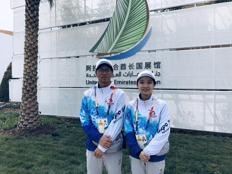 Wang Wanlu (a la derecha) trabaja como voluntario en el Pabellón de Emiratos árabes Unidos, 29 de abril del 2019. [Foto: Jin Dan/ Chinadaily. com.cn]