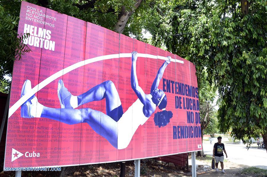 LA HABANA, 5 mayo, 2019 (Xinhua) -- Una persona camina frente a un cartel en el municipio Plaza de la Revolución, de La Habana, capital de Cuba, el 5 de mayo de 2019. Políticos, funcionarios y académicos cubanos han reaccionado con enérgico rechazo a la activación total por parte de Estados Unidos de la Ley Helms-Burton, que desde 1996 codifica el entramado legal del bloqueo impuesto a la isla hace más de medio siglo por la Casa Blanca. (Xinhua/Joaquín Hernández)