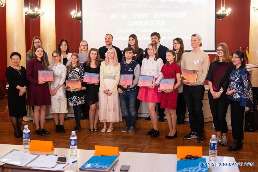 VILNA, 5 mayo, 2019 (Xinhua) -- Imagen del 4 de mayo de 2019 de participantes posando para una fotografía grupal en Vilna, capital de Lituania. La competencia de habilidades "Puente Chino" para estudiantes de secundaria y universitarios se llevó a cabo el sábado en Vilna. Los dos ganadores representarán a Lituania en la final para estudiantes extranjeros de secundaria en China. La serie de competencias del "Puente Chino" incluye aquellas para estudiantes de escuelas secundarias extranjeras y estudiantes universitarios extranjeros. Lanzado por la sede del Instituto Confucio de China en 2002 con el objetivo de alentar a los estudiantes extranjeros a aprender chino, la competencia ha atraído a más de 300.000 participantes. (Xinhua/Stefanija Kilmanaite)