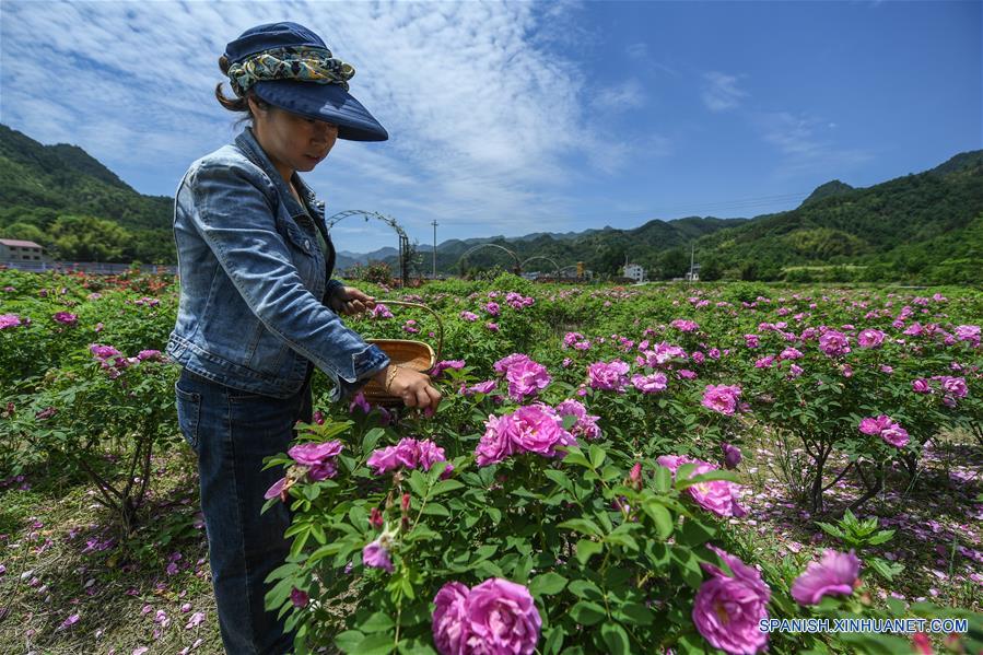 ZHEJIANG, 7 mayo, 2019 (Xinhua) -- Una empleada recolecta capullos de rosas para elaborar té, en un jardín en la villa de Xinfeng, en el poblado de Qingliangfeng, en la ciudad de Hangzhou, en la provincia de Zhejiang, en el este de China, el 7 de mayo de 2019. El jardín de rosas, ubicado en la villa de Xinfeng, con un área de más de 200 mu (13.3 hectáreas), se ha convertido en un destino turístico rural y una manera de incrementar el ingreso de los residentes. (Xinhua/Xu Yu)