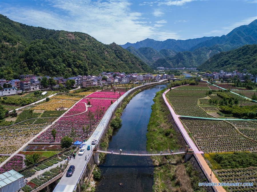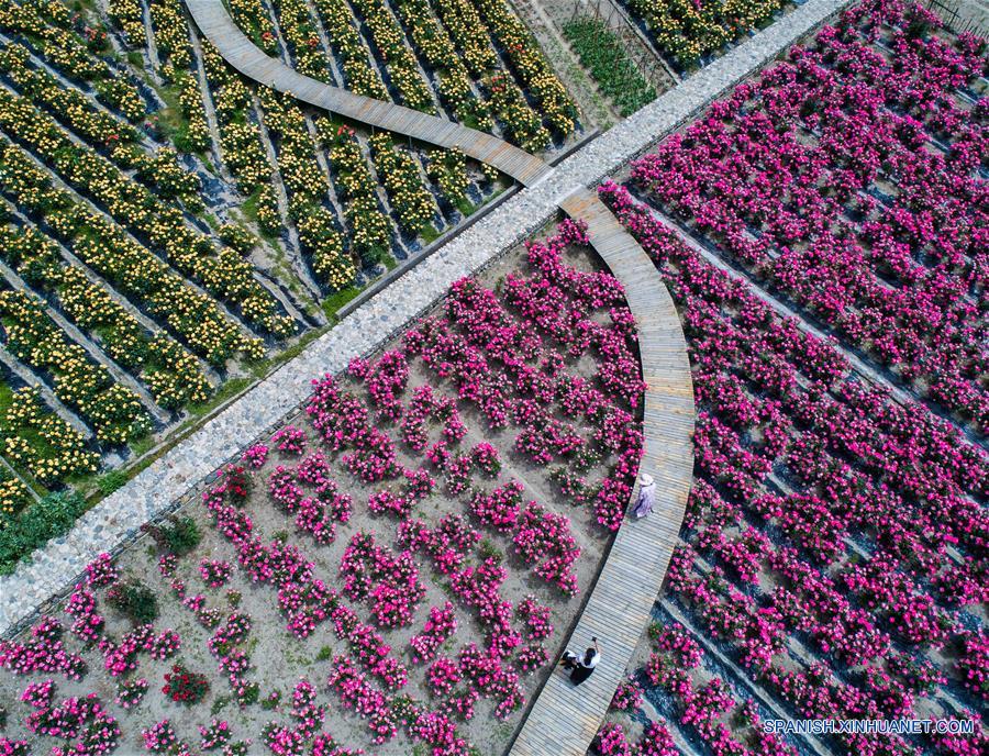 ZHEJIANG, 7 mayo, 2019 (Xinhua) -- Vista aérea de un jardín de rosas en la villa de Xinfeng, en el poblado de Qingliangfeng, en la ciudad de Hangzhou, en la provincia de Zhejiang, en el este de China, el 7 de mayo de 2019. El jardín de rosas, ubicado en la villa de Xinfeng, con un área de más de 200 mu (13.3 hectáreas), se ha convertido en un destino turístico rural y una manera de incrementar el ingreso de los residentes. (Xinhua/Xu Yu)