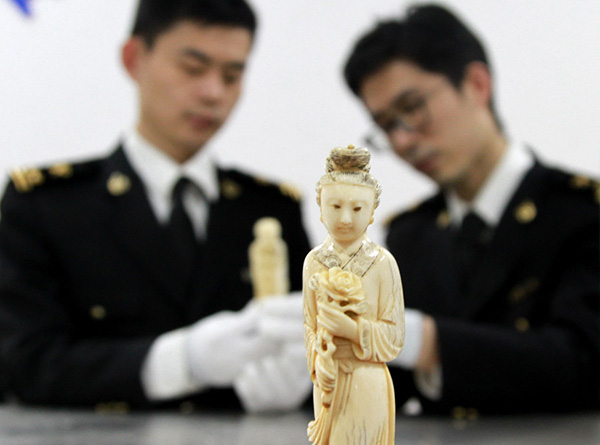 Funcionarios de aduanas muestran una figura de marfil interceptada en un paquete que viajó de Europa a Qingdao, provincia de Shandong, marzo del 2018. [Foto: Zhang Jingang/ China Daily]