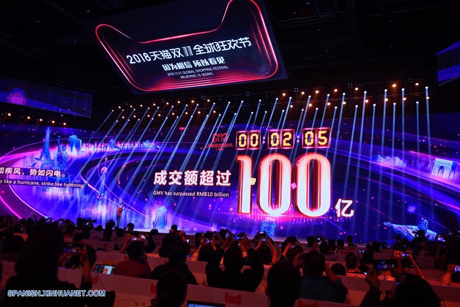 Imagen del 11 de noviembre de 2018 de una pantalla gigante mostrando ventas en TMall, la plataforma de ventas en línea propiedad de Alibaba, para el pico de compras por el Día de los Solteros, en Shanghai, en el este de China. La economía digital de China alcanzó los 31,3 billones de yuanes (unos 4,6 billones de dólares) en 2018, lo que representa un 34,8 por ciento del producto interior bruto (PIB) total del país, según un informe publicado el lunes por la Administración del Ciberespacio de China. El documento, dado a conocer en la presente 2a Cumbre Digital de China en la ciudad suroriental de Fuzhou, muestra que el sistema de innovación del país mejoró de forma continua. Los préstamos pendientes de empresas de ciencia y tecnología de China se ubicaron en 3,53 billones de yuanes al cierre del a?o pasado. La economía digital ha fomentado y fortalecido los nuevos motores de desarrollo del país, con 31,63 billones de yuanes de volumen de comercio electrónico y más de 9 billones de yuanes de ventas minoristas en línea en 2018, así como más de 600 millones de usuarios de pagos en línea, indica el informe. (Xinhua/Huang Zongzhi)