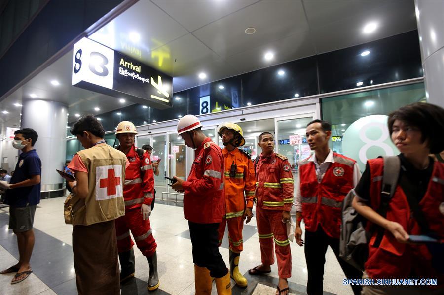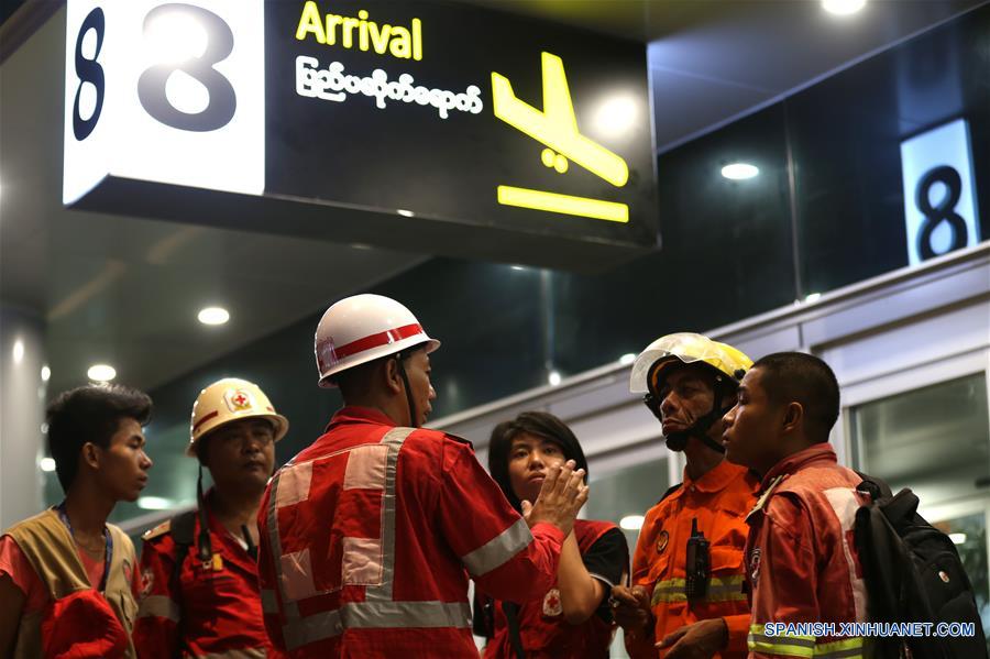 Rescatistas se reúnen en el Aereopuerto Internacional de Yangón, en Yangón, Myanmar, el 8 de mayo de 2019. Al menos 16 personas resultaron heridas el miércoles cuando un avión de pasajeros de Biman Bangladesh Airlines se salió de la pista de aterrizaje en el Aeropuerto Internacional de Yangón de Myanmar, informó la policía aeroportuaria. (Xinhua/U Aung)
