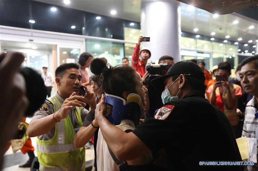 Una persona herida recibe tratamiento en el Aereopuerto Internacional de Yangón, en Yangón, Myanmar, el 8 de mayo de 2019. Al menos 16 personas resultaron heridas el miércoles cuando un avión de pasajeros de Biman Bangladesh Airlines se salió de la pista de aterrizaje en el Aeropuerto Internacional de Yangón de Myanmar, informó la policía aeroportuaria. (Xinhua/U Aung)
