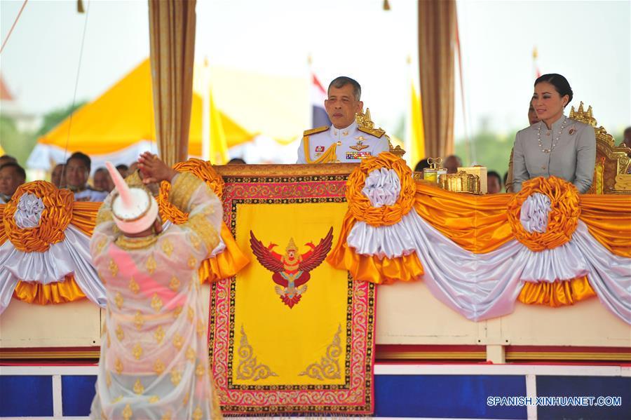 BANGKOK, 9 mayo 9, 2019 (Xinhua) -- El rey tailandés Maha Vajiralongkorn (c-arriba), y la reina Suthida (d-arriba), asisten a la ceremonia de arado anual, en Sanam Luang en Bangkok, Tailandia, el 9 de mayo de 2019. De acuerdo con información de la prensa local, el evento anual marca el inicio de la temporada de crecimiento del arroz en Tailandia. (Xinhua/Rachen Sageamsak)