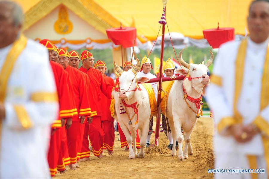 BANGKOK, 9 mayo, 2019 (Xinhua) -- Bueyes aran la tierra durante la ceremonia de arado anual, en Sanam Luang en Bangkok, Tailandia, el 9 de mayo de 2019. De acuerdo con información de la prensa local, el evento anual marca el inicio de la temporada de crecimiento del arroz en Tailandia. (Xinhua/Rachen Sageamsak)