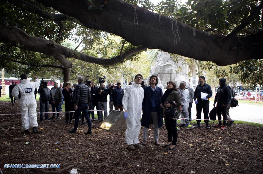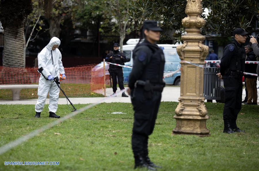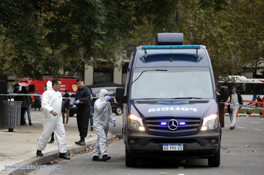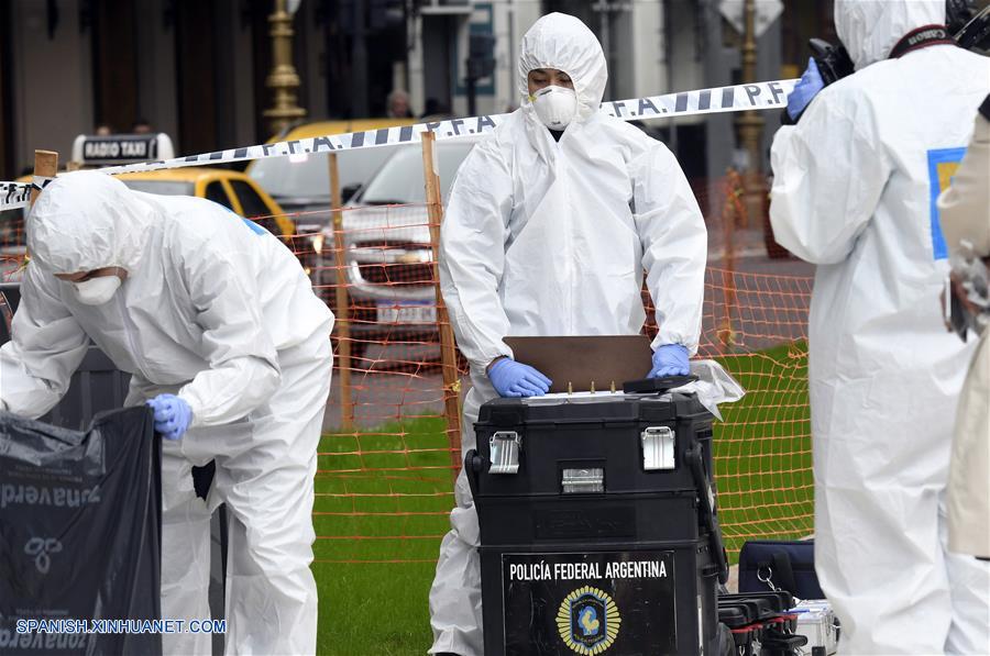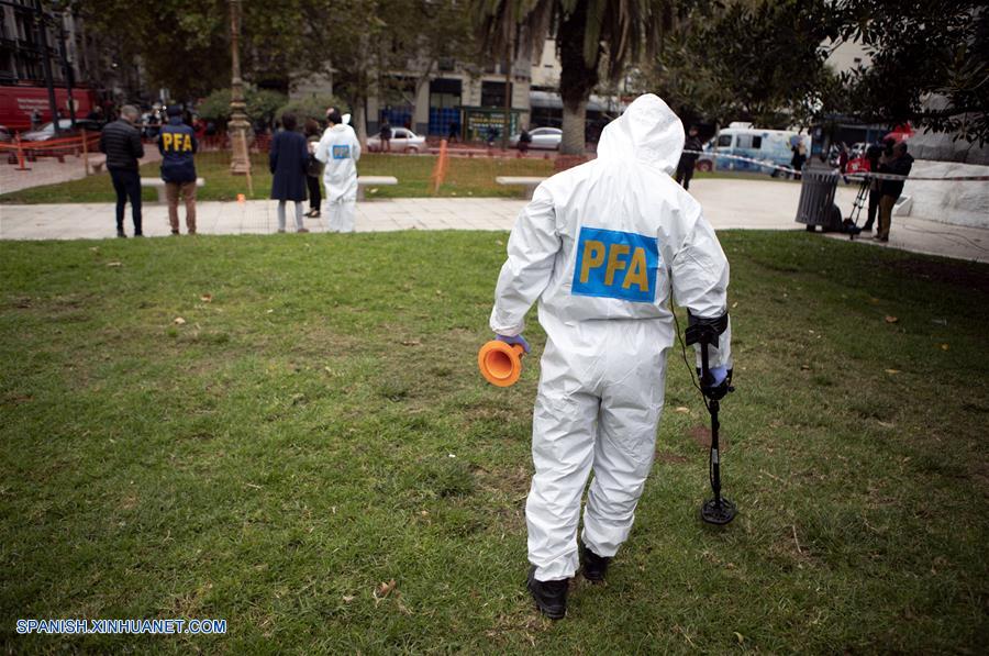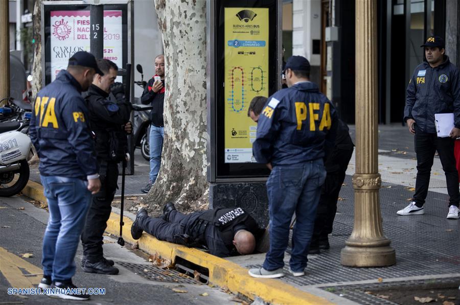 Elementos de la división de explosivos de la Policía Federal, inspeccionan las inmediaciones del sitio donde ocurrió un atentado en contra del diputado argentino, Héctor Olivares, de la Unión Cívica Radical (UCR), que forma parte del oficialista frente Cambiemos, en Buenos Aires, Argentina, el 9 de mayo de 2019. El diputado argentino Héctor Olivares, de la UCR, que forma parte del oficialista frente Cambiemos, resultó el jueves herido de gravedad al recibir impactos de arma de fuego de desconocidos cerca del Congreso Nacional en Buenos Aires, mientras que un acompa?ante murió. (Xinhua/Martín Zabala)