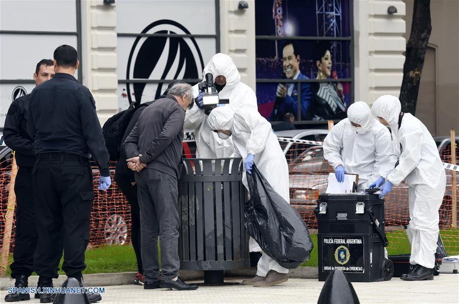 Imagen proveída por la agencia de noticias Télam de elementos de la policía científica inspeccionando un bote de basura, en el sitio donde ocurrió un atentado en contra del diputado argentino, Héctor Olivares, de la Unión Cívica Radical (UCR), que forma parte del oficialista frente Cambiemos, en Buenos Aires, Argentina, el 9 de mayo de 2019. El diputado argentino Héctor Olivares, de la UCR, que forma parte del oficialista frente Cambiemos, resultó el jueves herido de gravedad al recibir impactos de arma de fuego de desconocidos cerca del Congreso Nacional en Buenos Aires, mientras que un acompa?ante murió. (Xinhua/Analía Garelli/TELAM)
