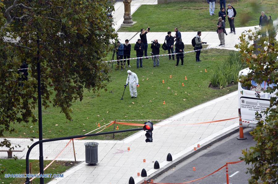 Elementos de la policía científica inspeccionan las inmediaciones del sitio donde ocurrió un atentado en contra del diputado argentino, Héctor Olivares, de la Unión Cívica Radical (UCR), que forma parte del oficialista frente Cambiemos, en Buenos Aires, Argentina, el 9 de mayo de 2019. El diputado argentino Héctor Olivares, de la UCR, que forma parte del oficialista frente Cambiemos, resultó el jueves herido de gravedad al recibir impactos de arma de fuego de desconocidos cerca del Congreso Nacional en Buenos Aires, mientras que un acompa?ante murió. (Xinhua/Martín Zabala)