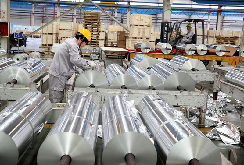 El 25 de abril de 2019, un trabajador de una empresa de aluminio en la Zona de Desarrollo Económico de Huaibei, en la provincia de Anhui, comprueba una bobina de aluminio de alta calidad antes de ser exportada. Foto de Diario del Pueblo