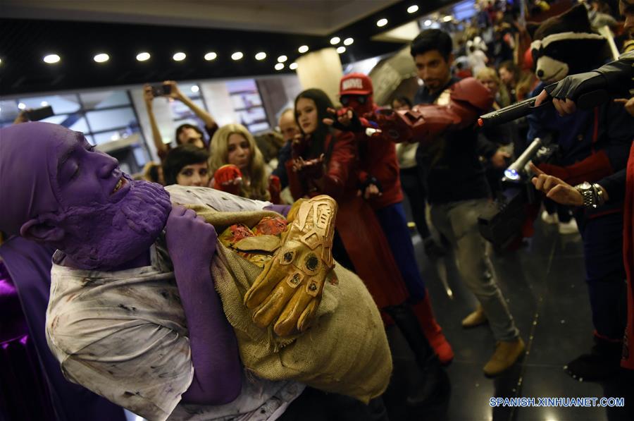 MONTEVIDEO, 11 mayo, 2019 (Xinhua) -- Un participante realizando cosplay del personaje "Thanos" reacciona durante la 17 edición de "Montevideo Comics", en el Auditorio Nacional del Sodre, en Montevideo, capital de Uruguay, el 11 de mayo de 2019. De acuerdo con información de la prensa local, el evento más importante para los aficionados de las historietas del país busca posicionarse como una de las mejores opciones culturales y de entretenimiento de la ciudad y ofrece una vasta agenda de actividades que se desarrollan en simultáneo en el Auditorio Nacional del Sodre y el Centro Cultural de Espa?a durante los días 11 y 12 de mayo. (Xinhua/Nicolás Celaya)
