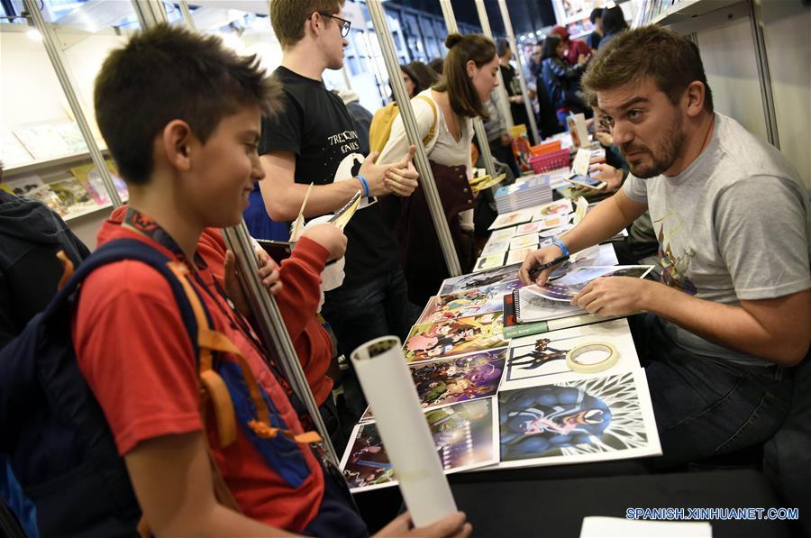 MONTEVIDEO, 11 mayo, 2019 (Xinhua) -- Un artista firma un cartel durante la 17 edición de "Montevideo Comics", en el Auditorio Nacional del Sodre, en Montevideo, capital de Uruguay, el 11 de mayo de 2019. De acuerdo con información de la prensa local, el evento más importante para los aficionados de las historietas del país busca posicionarse como una de las mejores opciones culturales y de entretenimiento de la ciudad y ofrece una vasta agenda de actividades que se desarrollan en simultáneo en el Auditorio Nacional del Sodre y el Centro Cultural de Espa?a durante los días 11 y 12 de mayo. (Xinhua/Nicolás Celaya)