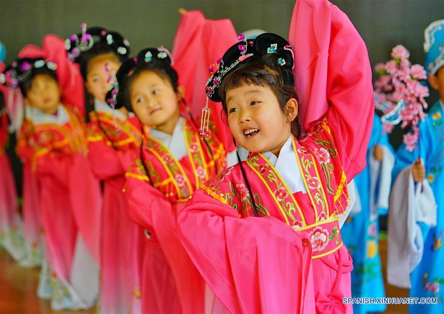HEBEI, 14 mayo, 2019 (Xinhua) -- Ni?as de jardín de ni?os aprenden ópera Pingju, en el condado de Luannan, de la provincia de Hebei, en el norte de China, el 14 de mayo de 2019. Una serie de clases sobre patrimonio cultural intangible se realizan en jardínes de ni?os, primarias y secundarias en el condado de Luannan, para desarrollar el interés de los estudiantes en cultura tradicional. (Xinhua/Yang Shiyao)
