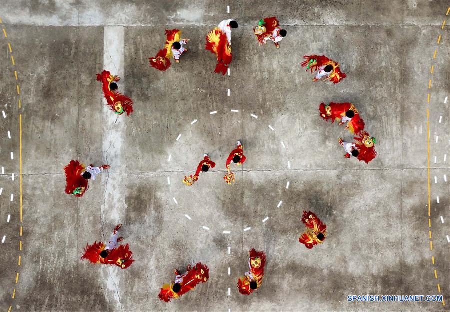 ANHUI, 14 mayo, 2019 (Xinhua) -- Vista aérea de estudiantes ensayando una local danza de león, un patrimonio cultural inmaterial, en la Escuela Primaria Mingde, en el municipio de Liuzhen del condado de Quanjiao, en la provincia de Anhui, en el este de China, el 14 de mayo de 2019. La Escuela Primaria de Mingde, en el municipio de Liuzhen, se ha comprometido a promover el patrimonio cultural inmaterial entre los estudiantes desde el semestre de oto?o de 2018. (Xinhua/Liu Junxi)