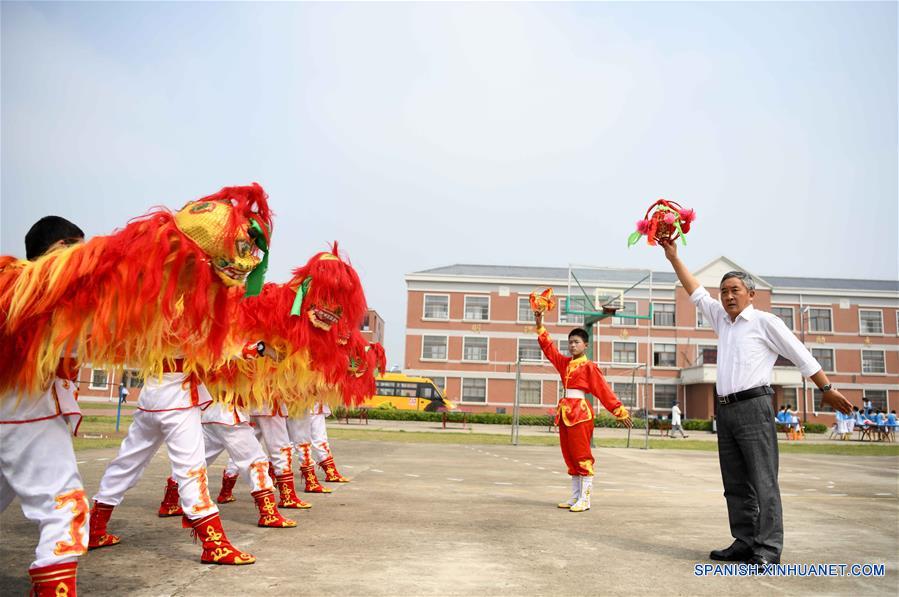 ANHUI, 14 mayo, 2019 (Xinhua) -- Han Zhengping (c), un sucesor del patrimonio cultural inmaterial en Anhui, ense?a a estudiantes a realizar una local danza de león en la Escuela Primaria Mingde, en el municipio de Liuzhen del condado de Quanjiao, en la provincia de Anhui, en el este de China, el 14 de mayo de 2019. La Escuela Primaria de Mingde, en el municipio de Liuzhen, se ha comprometido a promover el patrimonio cultural inmaterial entre los estudiantes desde el semestre de oto?o de 2018. (Xinhua/Liu Junxi)