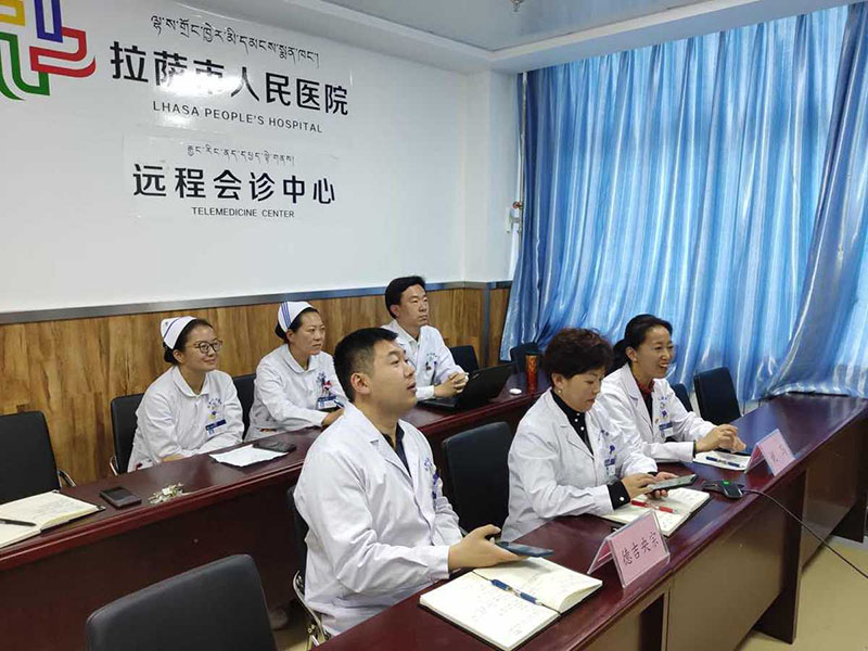 Los médicos reciben capacitación en el centro de teleconferencia del hospital del pueblo de Lhasa. [Foto: Proporcionada a chinadaily.com.cn]