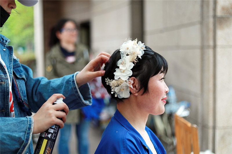 Aunque la mayoría de las participantes tienen entre 40 y 50 a?os, estilistas profesionales destacan su belleza y encantos. Gracias a un programa patrocinado por el Centro de Servicio de Yangpu, un total de 50 parejas del distrito Yangpu, en Shanghai, que laboran en servicios comunales, podrán hacerse fotos matrimoniales. Este programa, que comenzó hace 20 días, tiene como objetivo expresar la gratitud de la ciudad por sus trabajadores comunales. [Foto: Bo Kelin/ Chinadaily.com.cn]