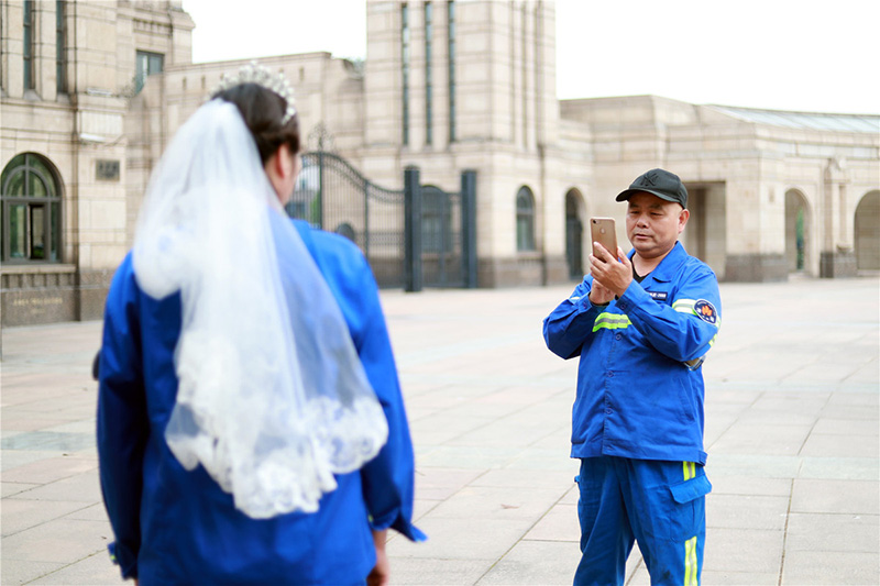 El esposo le toma fotos a su mujer mientras se cambia el vestido de novia. Gracias a un programa patrocinado por el Centro de Servicio de Yangpu, un total de 50 parejas del distrito Yangpu, en Shanghai, que laboran en servicios comunales, podrán hacerse fotos matrimoniales. Este programa tiene como objetivo expresar la gratitud de la ciudad por sus trabajadores comunales. [Foto: Bo Kelin/ Chinadaily.com.cn]