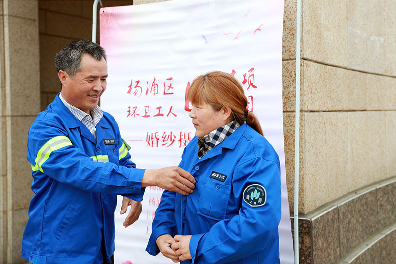 Gracias a un programa patrocinado por el Centro de Servicio de Yangpu, un total de 50 parejas del distrito Yangpu, en Shanghai, que laboran en servicios comunales, podrán hacerse fotos matrimoniales. Este programa tiene como objetivo expresar la gratitud de la ciudad por sus trabajadores comunales. [Foto: Bo Kelin/ Chinadaily.com.cn]