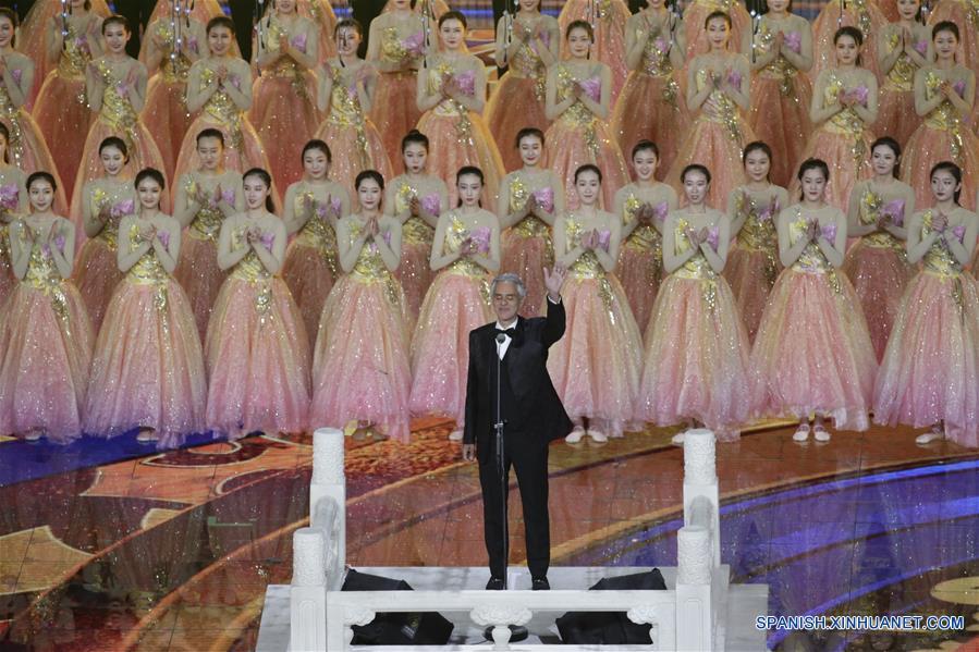 BEIJING, 15 mayo, 2019 (Xinhua) -- El cantante italiano, Andrea Bocelli (frente), canta "Nessun Dorma", una aria de la ópera "Turandot", en el carnaval de la cultura asiática, que se lleva a cabo en el Estadio Nacional, o Nido de Pájaro, en Beijing, capital de China, el 15 de mayo de 2019. (Xinhua/Shen Bohan)
