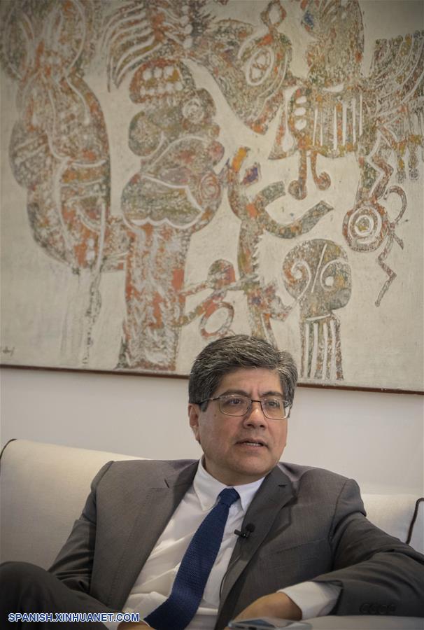 Imagen del 9 de mayo de 2019, del canciller ecuatoriano, José Valencia, en una entrevista con la Agencia de Noticias Xinhua, en Quito, capital de Ecuador. China se ha convertido en un actor importante en el mundo y ha hecho grandes contribuciones al desarrollo mundial, afirmó Valencia. (Xinhua/Santiago Armas)