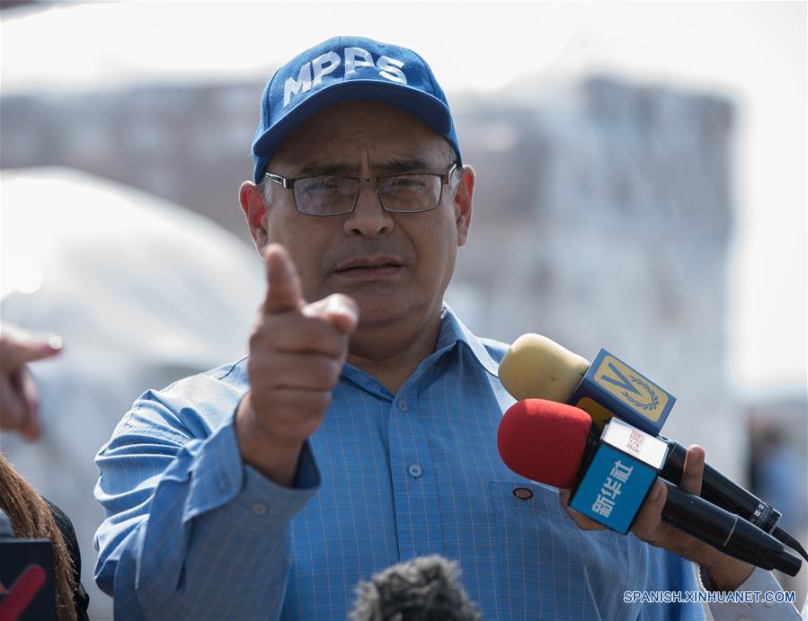 El ministro venezolano de Salud, Carlos Alvarado, habla ante periodistas durante la llegada de material médico quirúrgico, en el Aeropuerto Internacional Simón Bolívar, en el estado Vargas, Venezuela, el 16 de mayo de 2019. Venezuela recibió el jueves el tercer cargamento de asistencia técnica proveniente de China, con 64 toneladas de material médico quirúrgico, informó Alvarado. (Xinhua/Marcos Salgado) )