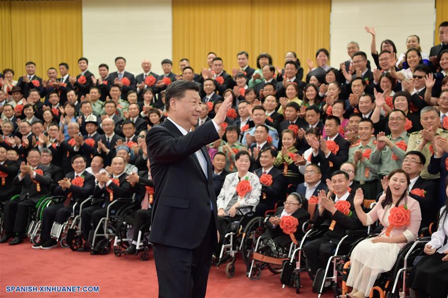 El presidente chino, Xi Jinping, también secretario general del Comité Central del Partido Comunista de China (PCCh) y presidente de la Comisión Militar Central, se reúne con representantes que asisten a una ceremonia para galardonar a personas modelo con discapacidades y personas que han hecho contribuciones sobresalientes para ayudar a los discapacitados, en el Gran Palacio del Pueblo, en Beijing, capital de China, el 16 de mayo de 2019. El primer ministro Li Keqiang y Wang Huning, miembro del Secretariado del Comité Central del PCCh, ambos miembros del Comité Permanente del Buró Político del Comité Central del PCCh, también se reunieron con los representantes. (Xinhua/Li Xueren)