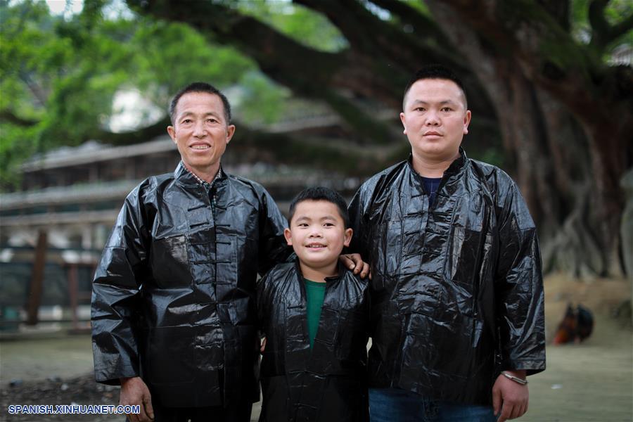GUIZHOU, 17 mayo, 2019 (Xinhua) -- Imagen del 17 de abril de 2019 de Wu You (c), un residente de 8 a?os de edad del grupo étnico Dong, posando con su padre Wu Fagui (d), y su abuelo Wu Zhiji (i), en la aldea de Sizhai del municipio de Shuangjiang, distrito de Liping, en la Prefectura Autónoma Miao y Dong de Qiandongnan, provincia de Guizhou, en el suroeste de China. Wu You ha estado practicando la lucha libre tradicional del grupo étnico Dong entrenado por su padre Wu Fagui, un ex campeón de esta disciplina. En abril, compitió como el luchador más joven de la aldea de Sizhai en el Festival de Lucha Libre anual. Wu Fagui, el padre de Wu You, fue entrenado también por su padre Wu Zhiji cuando era ni?o. Al igual que la familia de Wu, la lucha libre tradicional del grupo étnico Dong ha pasado de generación en generación durante cerca de 400 a?os. Cada a?o alrededor del día 15 del tercer mes del calendario lunar chino, las personas de la zona se visten con trajes tradicionales para celebrar el Festival de Lucha Libre. (Xinhua/Liu Xu)