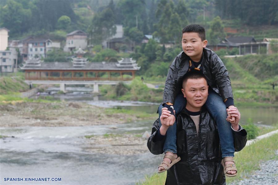 GUIZHOU, 17 mayo, 2019 (Xinhua) -- Imagen del 15 de abril de 2019 de Wu You (arriba), un residente de 8 a?os de edad del grupo étnico Dong, sentándose sobre los hombros de su padre Wu Fagui (abajo), en la aldea de Sizhai del municipio de Shuangjiang, distrito de Liping, en la Prefectura Autónoma Miao y Dong de Qiandongnan, provincia de Guizhou, en el suroeste de China. Wu You ha estado practicando la lucha libre tradicional del grupo étnico Dong entrenado por su padre Wu Fagui, un ex campeón de esta disciplina. En abril, compitió como el luchador más joven de la aldea de Sizhai en el Festival de Lucha Libre anual. Wu Fagui, el padre de Wu You, fue entrenado también por su padre Wu Zhiji cuando era ni?o. Al igual que la familia de Wu, la lucha libre tradicional del grupo étnico Dong ha pasado de generación en generación durante cerca de 400 a?os. Cada a?o alrededor del día 15 del tercer mes del calendario lunar chino, las personas de la zona se visten con trajes tradicionales para celebrar el Festival de Lucha Libre. (Xinhua/Ou Dongqu)